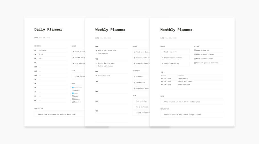 Include daily planner, weekly planner and monthly planner.